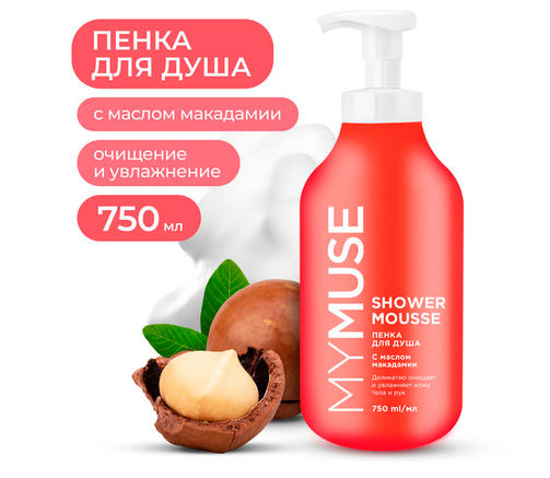 MY MUSE Пенка для душа с маслом макадамии и экстрактом черного перца 750 мл - пенка для душа с бархатной текстурой и нежным ароматом, созданная на основе высококачественных компонентов, обеспечивает деликатный уход за кожей. Молочный протеин оказывает благотворное воздействие на кожу, благодаря содержанию большого количества аминокислот (увлажняет, смягчает, питает). Масло макадамии выравнивает рельеф, омолаживает, тонизирует, витаминизирует и восстанавливает вашу кожу. Нежная гель-пенка для душа очищает, ухаживает и увлажняет, равномерно распределяется по коже и легко смывается водой, даря удовольствие всей семье. Специальный пенный дозатор обеспечивает экономичный расход. 480,00 ₽ / шт