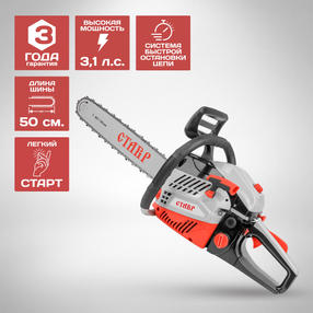 Ставр ПЦБ-50/2300 Пила цепная БЕНЗИНОВАЯ, шина 50см, двигатель 58 куб.см, 2300Вт. 2800-3000 об/мин