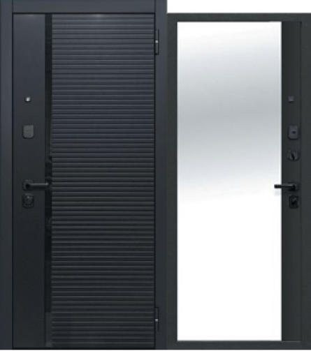 Внешнее покрытие фрезерованная МДФ-панель 8 мм, цвет – сатин черный Внутреннее покрытие МДФ-панель 10 мм, цвет – сатин черный, накладное зеркало с защитной плёнкой Толщина дверного полотна 85 мм Глубина дверного короба 105 мм Наполнитель пенополистирол Уплотнитель 2 контура уплотнителя из вспененной резины (2 на полотне, 1 на коробе) Ручка раздельная, цвет - черный Глазок широкого обзора; цвет - черный Петли 2 шт., наружные, открывание 180° Основной замок цилиндровый KARAT/MONARCH, IV (наивысший) класс взломостойкости; диаметр ригелей: 16 мм Дополнительный замок сувальдный KARAT/MONARCH, IV (наивысший) класс взломостойкости, дополнительная защита от высверливания: две пластины из высоколегированной стали с обеих сторон замка; диаметр ригелей: 16 мм Накладки врезная броненакладка основного замка, овальная накладка дополнительного замка с защитой от сквозняка; цвет - черный Независимая ночная задвижка Да Регулировка прижима притвора металлический эксцентрик для защёлки на основном замке Противосъём штыри, 2 шт. Размеры 860х2050 мм, 960х2050 мм 41 600,00 ₽ / шт