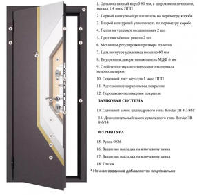 Производство Страна Россия Наличие товара Под заказ Производитель Buldoors Применение Назначение двери В квартиру Образец В наличии Конструкция Толщина металла рулонная холоднокатаная сталь 1,4/1 мм с ППП Толщина полотна 60 мм Короб цельнокатаный 80 мм / наличник 55 мм Петли 2 шт. / на упорных подшипниках Противосъемные ригели 2 шт. / с петлевой стороны Механизм притвора полотна Есть Материал Материал внешней отделки Металл Материал внутренней отделки Металл Наполнение Пенополистирол Покрытие металла порошково-полимерное Полотно цельногнутое 60 мм Уплотнитель 2-х контурный трубчатый / 2 по периметру короба Утепление Утепление полотна пенополистирол Морозостойкие (терморазрыв) Без терморазрыва Замки Замки 2 замка BORDER Ночная задвижка Платная опция Внешний вид Цвет внешней отделки Букле шоколад Рисунок внешней отделки RL-2 Цвет внутренней отделки Букле шоколад Рисунок внутренней отделки без рисунка Декоративная панель внешняя МДФ 10 мм / внутренняя МДФ 6 мм / лист металла Ручка 0826 (хром) Глазок обзор 180° 25 900,00 ₽ / шт