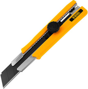Нож Denzel 78945 выполнен в корпусе из термопластичной резины TPR, со сменным лезвием шириной 25 мм, изготовленным из стали SK4, оснащен винтовым фиксатором и металлической направляющей. Сверхострое выдвижное лезвие легко режет линолеум, ковролин, бумагу, обои, картон и другие листовые материалы. Нож рекомендован для профессионального применения, пригодится также в домашнем хозяйстве. Благодаря сегментной структуре полотна можно быстро восстановить работоспособность ножа: достаточно отломить затупившийся сегмент по линии насечки при помощи плоскогубцев или другого шарнирно-губцевого инструмента. При обламывании необходимо использовать средства индивидуальной защиты (очки и перчатки). Преимущества Прочность и износостойкость — лезвие изготовлено из японской инструментальной стали SK4, режущая кромка твердостью 65 HRC долго сохраняет остроту. Надежность — благодаря металлической направляющей лезвие не сломается даже при высоких нагрузках. Удобное использование — винтовой фиксатор удерживает лезвие в нужном положении. Комфортная работа — прорезиненный корпус не выскальзывает из руки. 405,00 ₽ / шт
