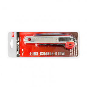 Нож Matrix 78921 с выдвижным лезвием шириной 18 мм, металлической направляющей, обрезиненной ручкой и 5 лезвиями в комплекте используется для резки отделочных материалов — обоев, линолеума, — а также картона, бумаги, пленки, скотча. Выдвижное полотно закрепляется в рабочем положении автоматически, а металлическая направляющая придает прочность конструкции и обеспечивает долговечность инструмента. Нож подходит как для бытового, так и для профессионального применения. Преимущества Полотно толщиной 0,5 мм долго сохраняет режущую способность, т.к. изготовлено из высокоуглеродистой стали 60. Во время работы лезвие остается в заданном положении, т.к. дополнительно фиксируется винтом. Затачивать полотно не нужно, поскольку затупившийся сегмент просто отламывается. Предусмотрена возможность замены лезвий, поэтому инструмент подходит для длительного использования. Сменные полотна не потеряются, поскольку хранятся в обойме внутри корпуса. Замена лезвий происходит мгновенно при помощи автоматического механизма. Покупать расходники не придется, ведь в комплект входит 5 полотен. Нож удобно лежит в руке благодаря резиновым вставкам на корпусе. 235,00 ₽ / шт