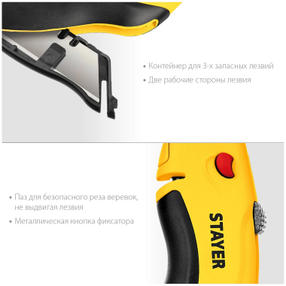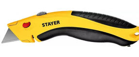 Универсальный нож STAYER с трапециевидным лезвием для реза различных материалов (линолеум, ковровые покрытия, гипсолитовые плиты, гипсокартон, кровельные материалы, пластик, дерево). Применяется для реза различных материалов Прочный металлический обрезиненный корпус; Выдвижное лезвие - автостоп; Быстрая смена лезвия нажатием одной кнопки; Паз для реза веревок; Встроенная кассета для хранения лезвий с быстрым доступом; Трапециевидное двухстороннее лезвие из стали 65Mn с двойной заточкой 800,80 ₽ / шт