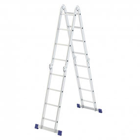 Шарнирная алюминиевая лестница Сибртех 97882 представляет собой 4 секции по 4 ступени, которые можно настроить в нескольких рабочих положениях. Она может использоваться в качестве приставной лестницы, двухсторонней стремянки и помоста. Будет полезна как в быту, так и на небольших стройках, в гараже и магазинах. Преимущества Широкие траверсы — лестница устойчиво фиксируется на горизонтальной поверхности в любом рабочем положении. Противоскользящее рифление на ступенях — пользоваться лестницей безопасно, нога не соскользнет в процессе выполнения работ. Сочетание легкости и прочности — рама изготовлена из прессованного алюминиевого профиля прямоугольного сечения, выдерживает нагрузку до 120 кг. Надежные шарнирные механизмы — лестница не шатается в рабочих положениях, смена рабочих положений происходит быстро и легко. Габариты в сложенном состоянии 1220 х 340 х 280 мм — лестницу удобно хранить и транспортировать. 14 800,00 ₽ / шт