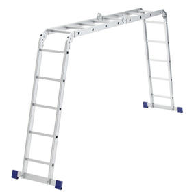 Шарнирная алюминиевая лестница Сибртех 97879 представляет собой 2 секции по 4 ступени и 2 секции по 5 ступеней, которые можно настроить в нескольких рабочих положениях. Она может использоваться в качестве приставной лестницы, двухсторонней стремянки и помоста. Будет полезна как в быту, так и на небольших стройках, в гараже и магазинах. Преимущества Широкие траверсы — лестница устойчиво фиксируется на горизонтальной поверхности в любом рабочем положении. Противоскользящее рифление на ступенях — пользоваться лестницей безопасно, нога не соскользнет в процессе выполнения работ. Сочетание легкости и прочности — рама изготовлена из прессованного алюминиевого профиля прямоугольного сечения, выдерживает нагрузку до 120 кг. Надежные шарнирные механизмы — лестница не шатается в рабочих положениях, смена рабочих положений происходит быстро и легко. 19 600,00 ₽ / шт