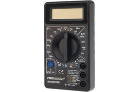 Мультиметр — электроизмерительный прибор, который включает в себя несколько функций и набор измеряемых параметров. Все приборы серии M838 измеряют постоянное и переменное напряжение, постоянный ток, сопротивление в цепи и даже температуру — модель М838. А также с помощью данного прибора можно проводить тестирование диодов. Прибор M838 является портативным мультиметром, компактные размеры позволяют всегда носить его с собой. Но, несмотря на малые размеры, данный мультиметр обладает широким функционалом и это выгодно отличает его от других. Характеристики: Постоянное напряжение: 200 mВ (±0.5%+3), 2000 мВ/20 В/200 В (±0,8%+5), 1000 В (±1,0%+5) Переменное напряжение: 200 В/750 В (±2,0%+10) Постоянный ток: 200 мкА/2000 мкА/20 мА (±1.8%+2), 200 мА (±2,0%+2), 10 A (±2.0%+10) Сопротивление: 200 Ом (±1,0%+10), 200 Ом/20 КОм/200 КОм/2000 КОм (±1,0%+4) Температура: –40...+150 °С(±1.0%+4), 150...1370 °С(±1,5%+15) Тестирование диодов/транзисторов (hfe) Прозвонка целостности цепи 3,5-разрядный дисплей Тип батареи: PROconnect 9 В «Крона» (в комплекте) 800,00 ₽ / шт